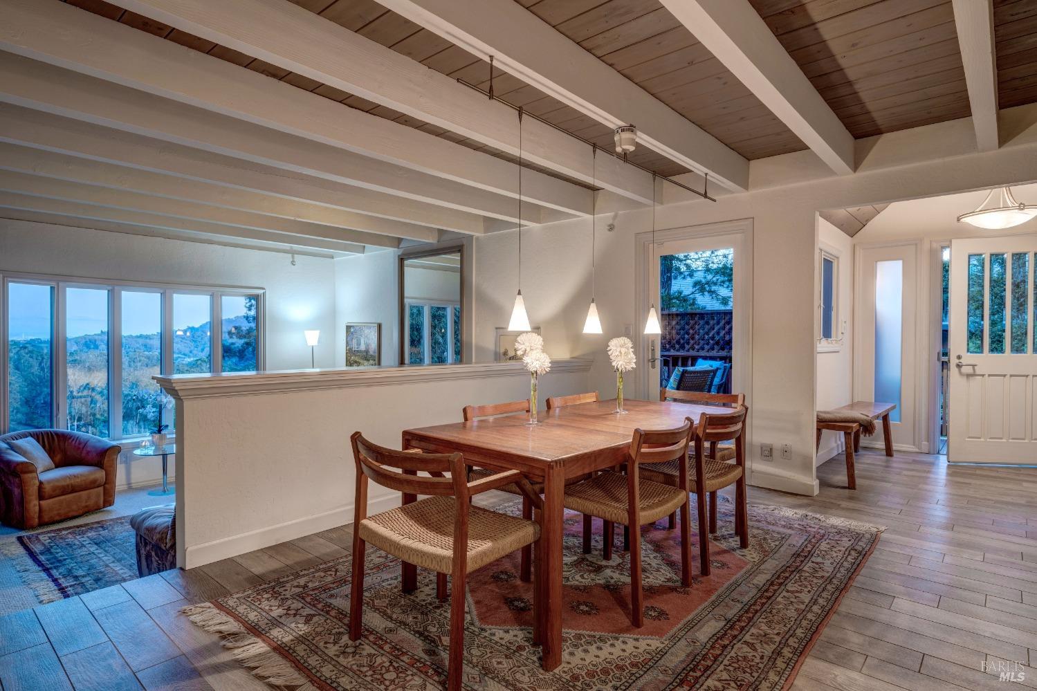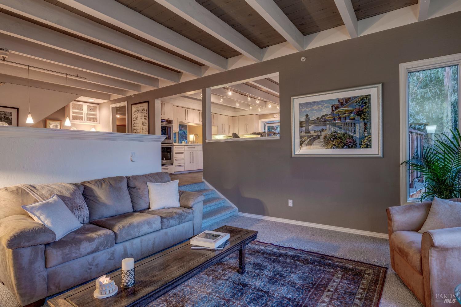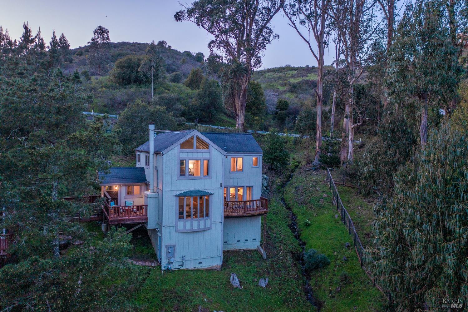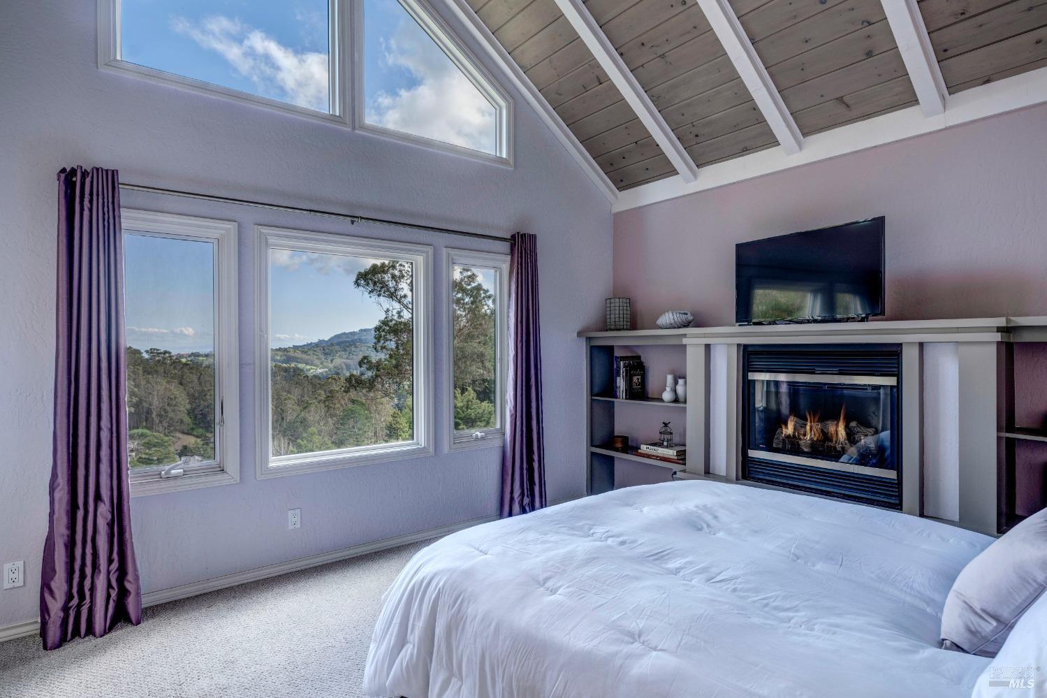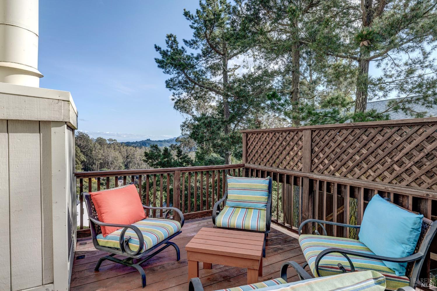 Nestled in a private setting, this stunning property seamlessly blends breathtaking views, natural beauty, and refined living. The sunken living room has vaulted ceilings & expansive windows that showcase views of the Bay Bridge and the East Bay hills. The gourmet kitchen, a haven for culinary enthusiasts and entertainers alike, is equipped with a six-top Viking range, double oven, two sinks, & complemented by an adjacent deck. The upper level features the primary suite - a showstopper - where cozy fireside evenings await and the sunrise greets you as you start the day in a spa-like bathroom. Two additional bedrooms, conveniently connected to a shared bathroom, complete the second story. The fourth bedroom, with ensuite bathroom, located on the main level, offers versatile use as a family room or media space. Meticulously maintained by a single owner for the past 35 years, this move-in ready home exudes pride of ownership. Parking for two cars and ample storage area add to the convenience. Embrace the outdoor lifestyle with proximity to the Golden Gate National Recreation Area, offering endless opportunities for hiking, biking, and beach adventures. Easy access to Mill Valley's vibrant culinary scene, upscale boutiques, award winning schools and Highway 101.