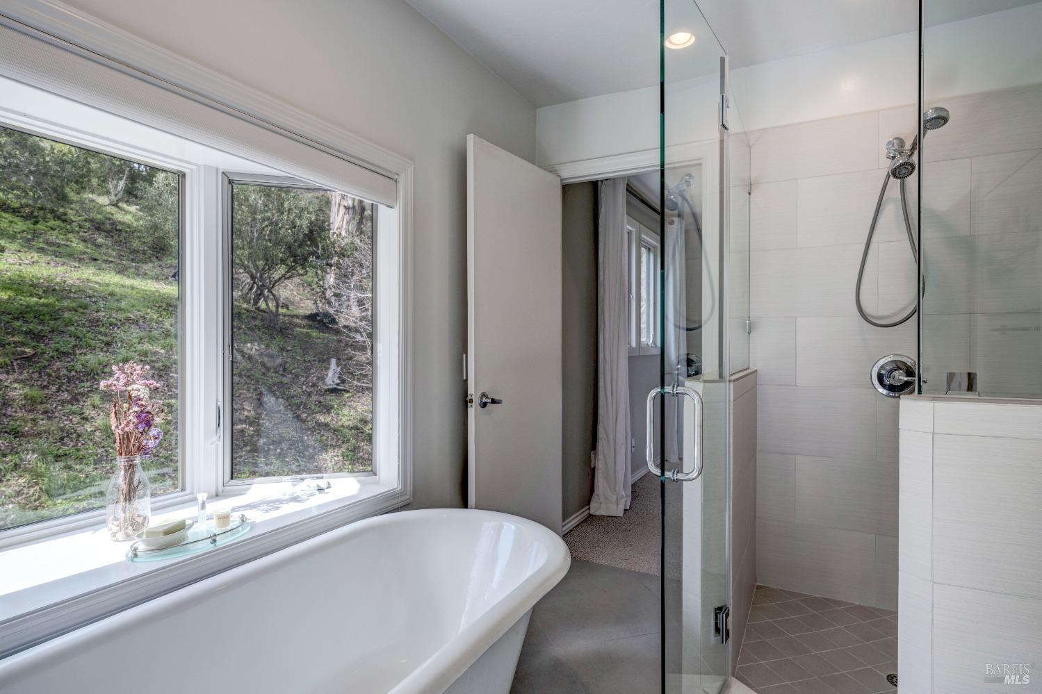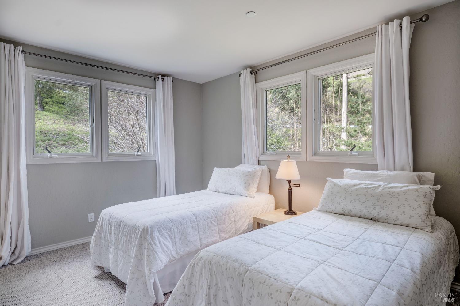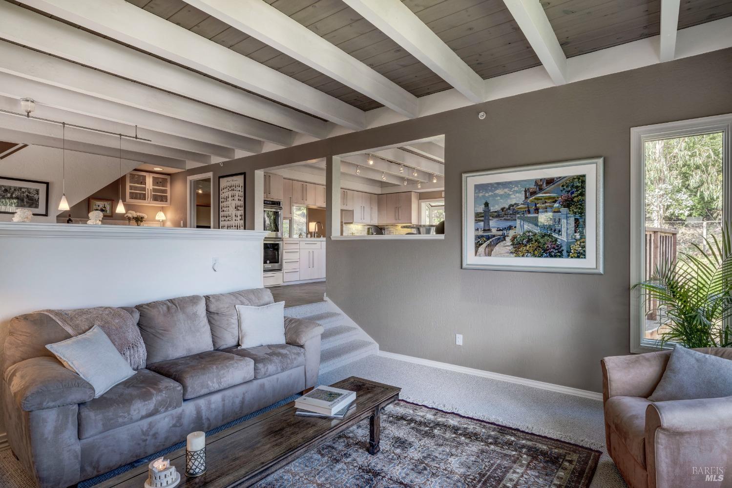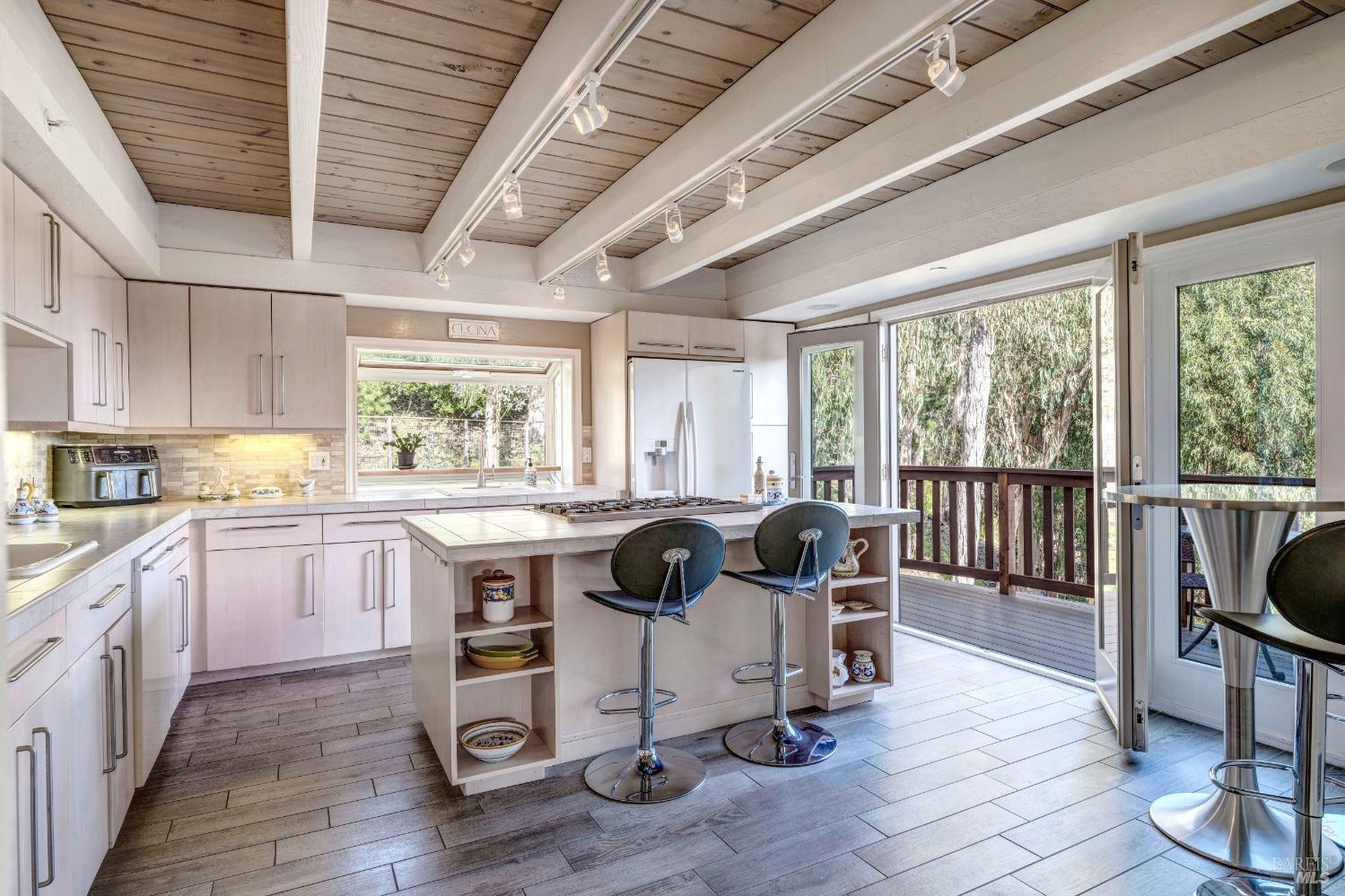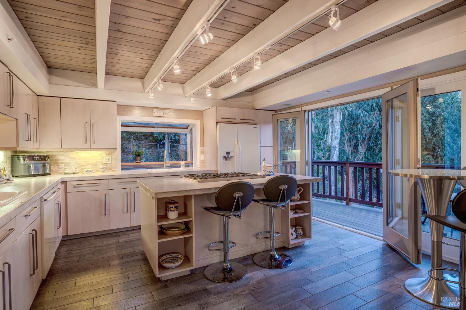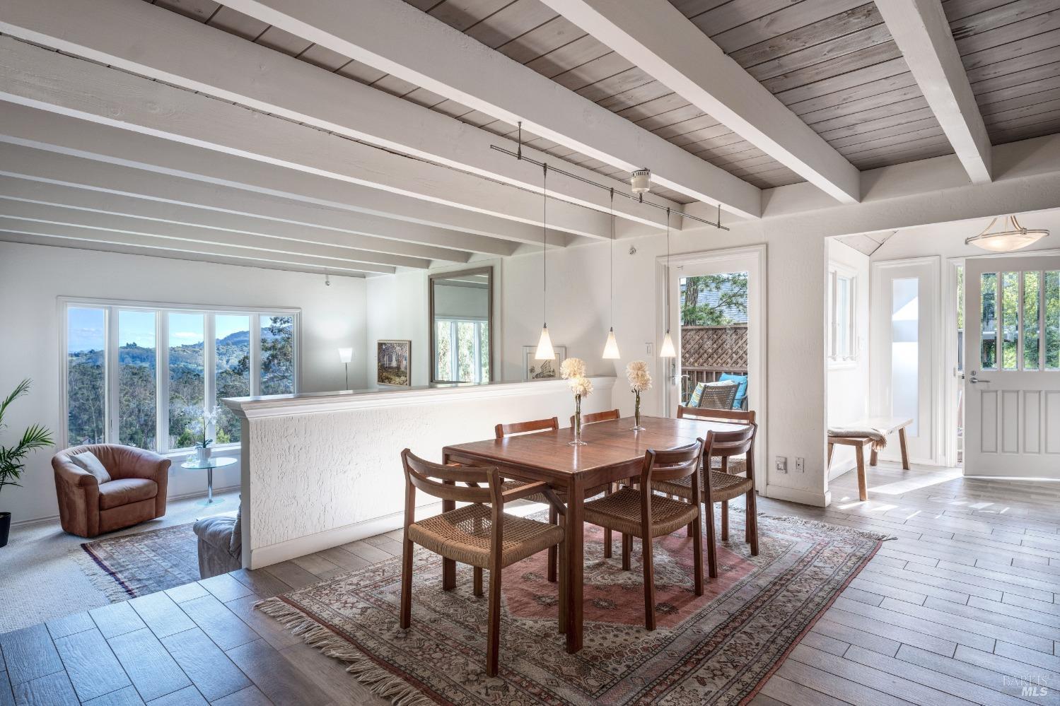 Nestled in a private setting, this stunning property seamlessly blends breathtaking views, natural beauty, and refined living. The sunken living room has vaulted ceilings & expansive windows that showcase views of the Bay Bridge and the East Bay hills. The gourmet kitchen, a haven for culinary enthusiasts and entertainers alike, is equipped with a six-top Viking range, double oven, two sinks, & complemented by an adjacent deck. The upper level features the primary suite - a showstopper - where cozy fireside evenings await and the sunrise greets you as you start the day in a spa-like bathroom. Two additional bedrooms, conveniently connected to a shared bathroom, complete the second story. The fourth bedroom, with ensuite bathroom, located on the main level, offers versatile use as a family room or media space. Meticulously maintained by a single owner for the past 35 years, this move-in ready home exudes pride of ownership. Parking for two cars and ample storage area add to the convenience. Embrace the outdoor lifestyle with proximity to the Golden Gate National Recreation Area, offering endless opportunities for hiking, biking, and beach adventures. Easy access to Mill Valley's vibrant culinary scene, upscale boutiques, award winning schools and Highway 101.