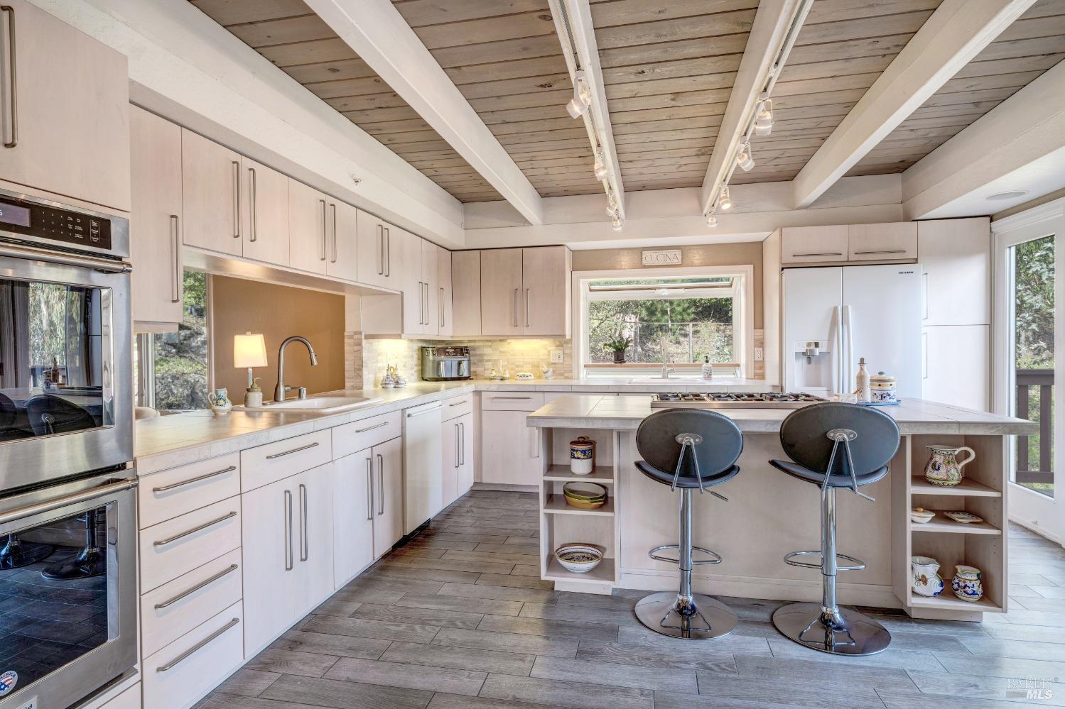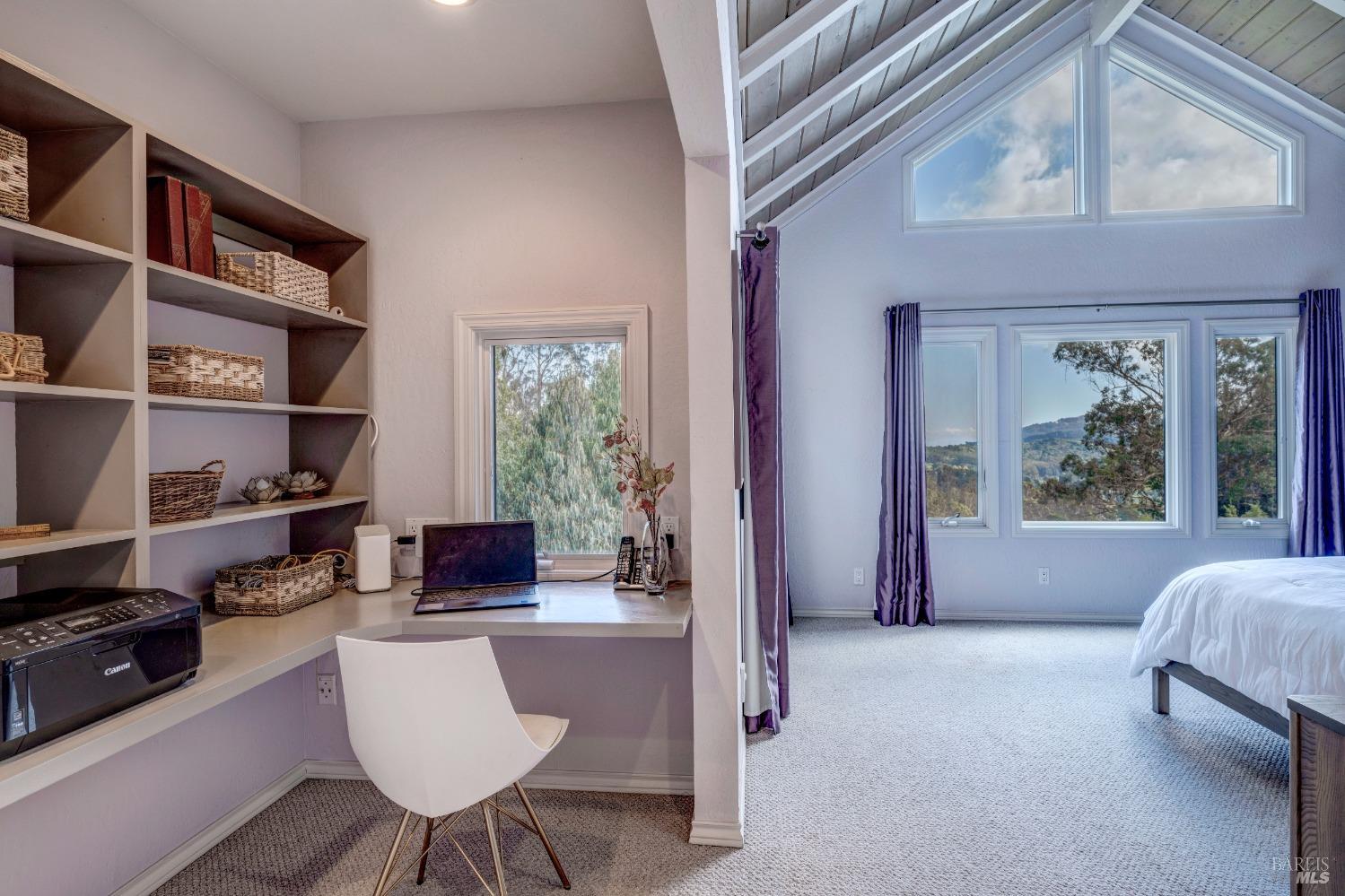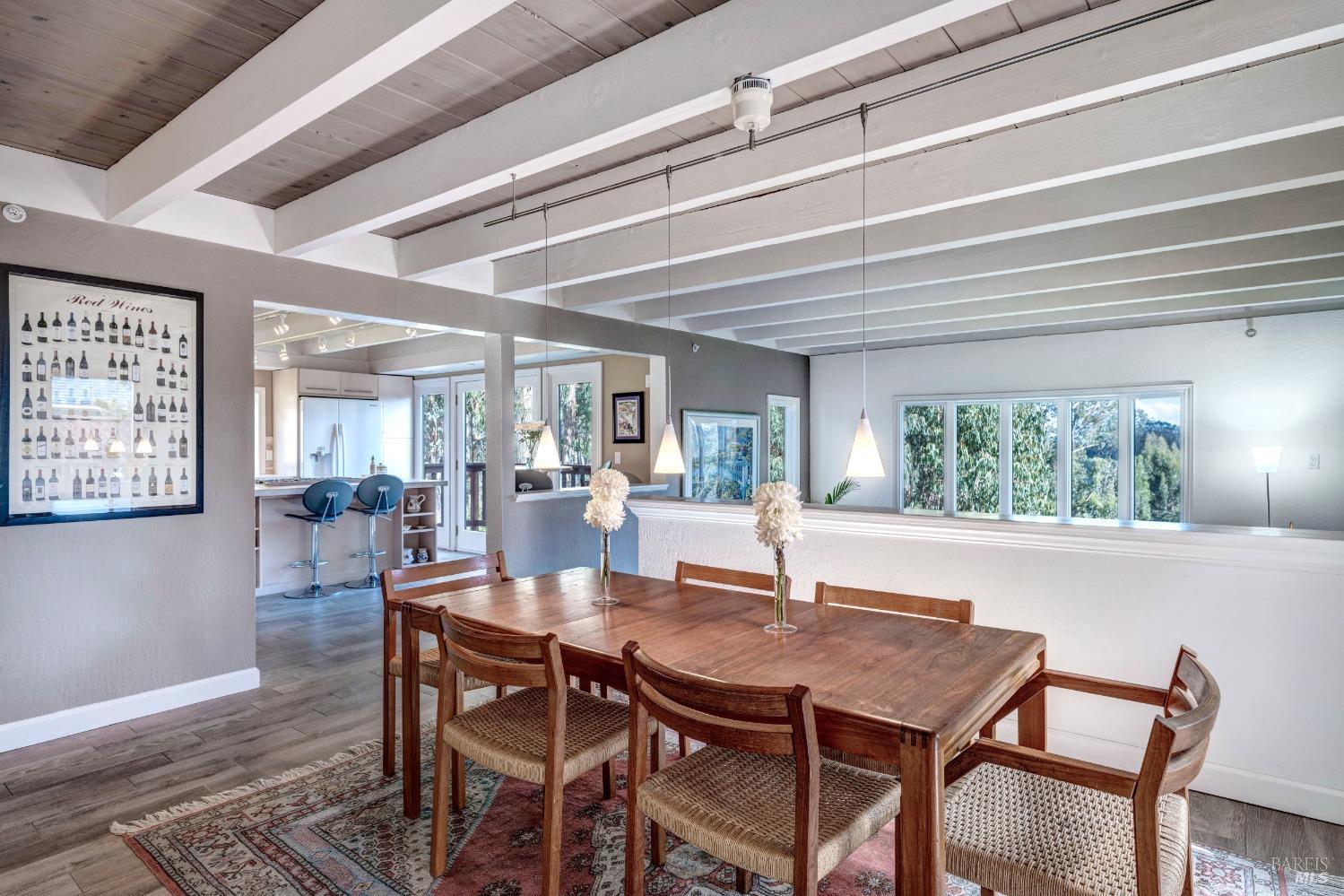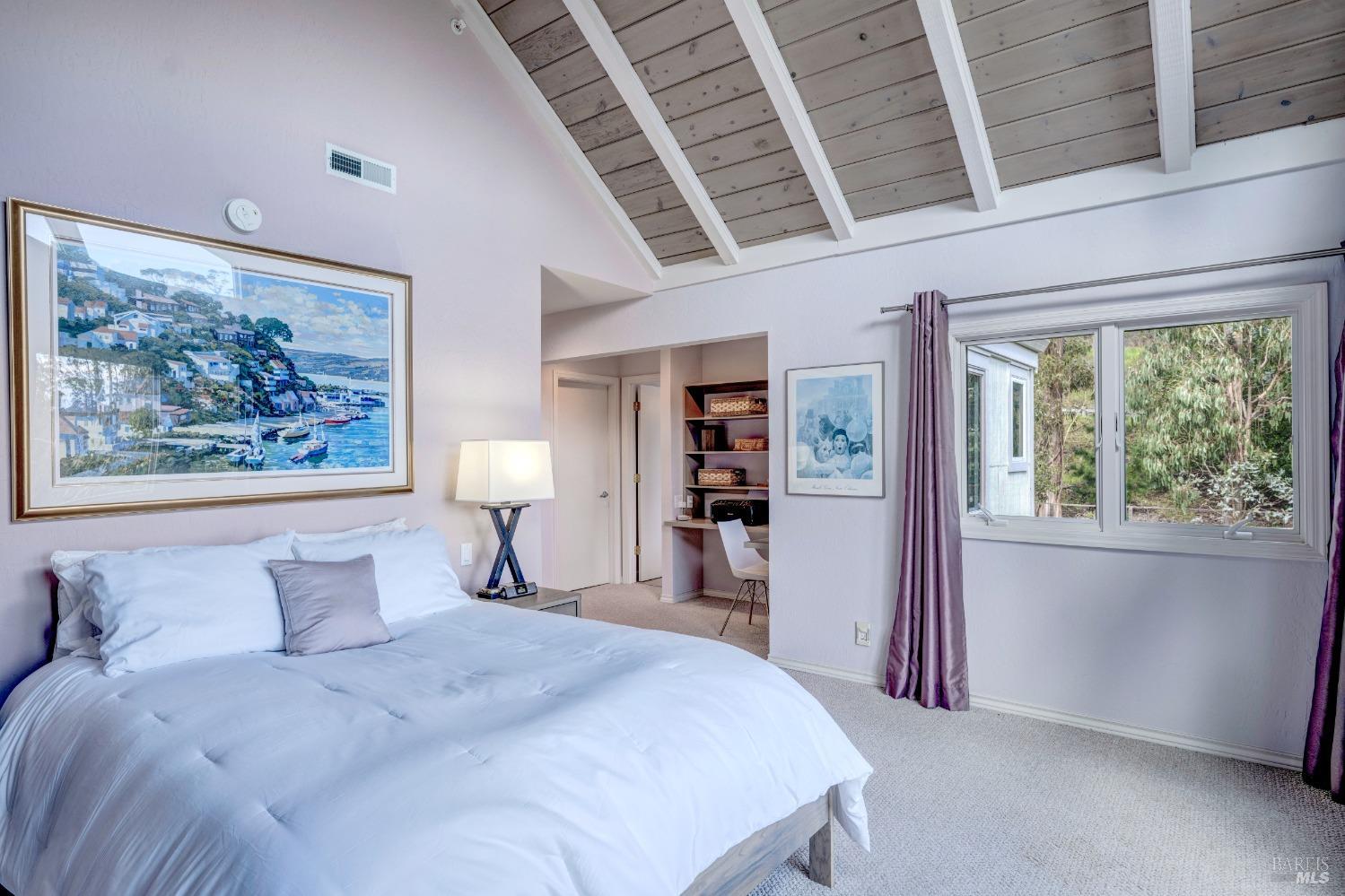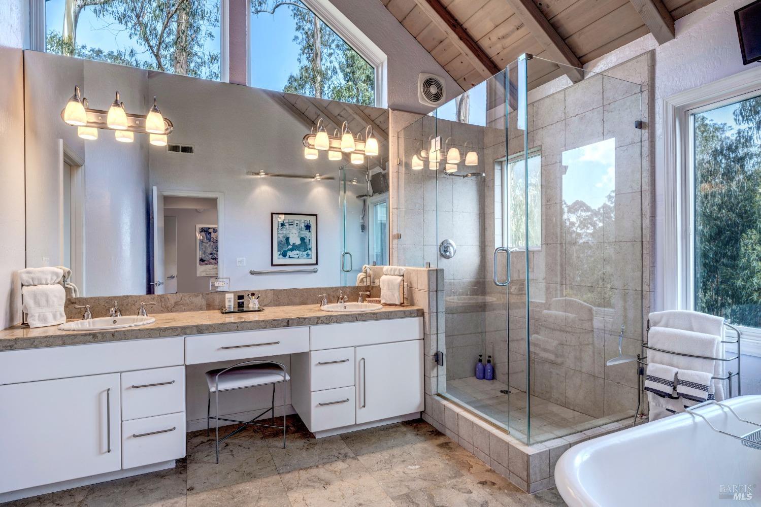 Nestled in a private setting, this stunning property seamlessly blends breathtaking views, natural beauty, and refined living. The sunken living room has vaulted ceilings & expansive windows that showcase views of the Bay Bridge and the East Bay hills. The gourmet kitchen, a haven for culinary enthusiasts and entertainers alike, is equipped with a six-top Viking range, double oven, two sinks, & complemented by an adjacent deck. The upper level features the primary suite - a showstopper - where cozy fireside evenings await and the sunrise greets you as you start the day in a spa-like bathroom. Two additional bedrooms, conveniently connected to a shared bathroom, complete the second story. The fourth bedroom, with ensuite bathroom, located on the main level, offers versatile use as a family room or media space. Meticulously maintained by a single owner for the past 35 years, this move-in ready home exudes pride of ownership. Parking for two cars and ample storage area add to the convenience. Embrace the outdoor lifestyle with proximity to the Golden Gate National Recreation Area, offering endless opportunities for hiking, biking, and beach adventures. Easy access to Mill Valley's vibrant culinary scene, upscale boutiques, award winning schools and Highway 101.