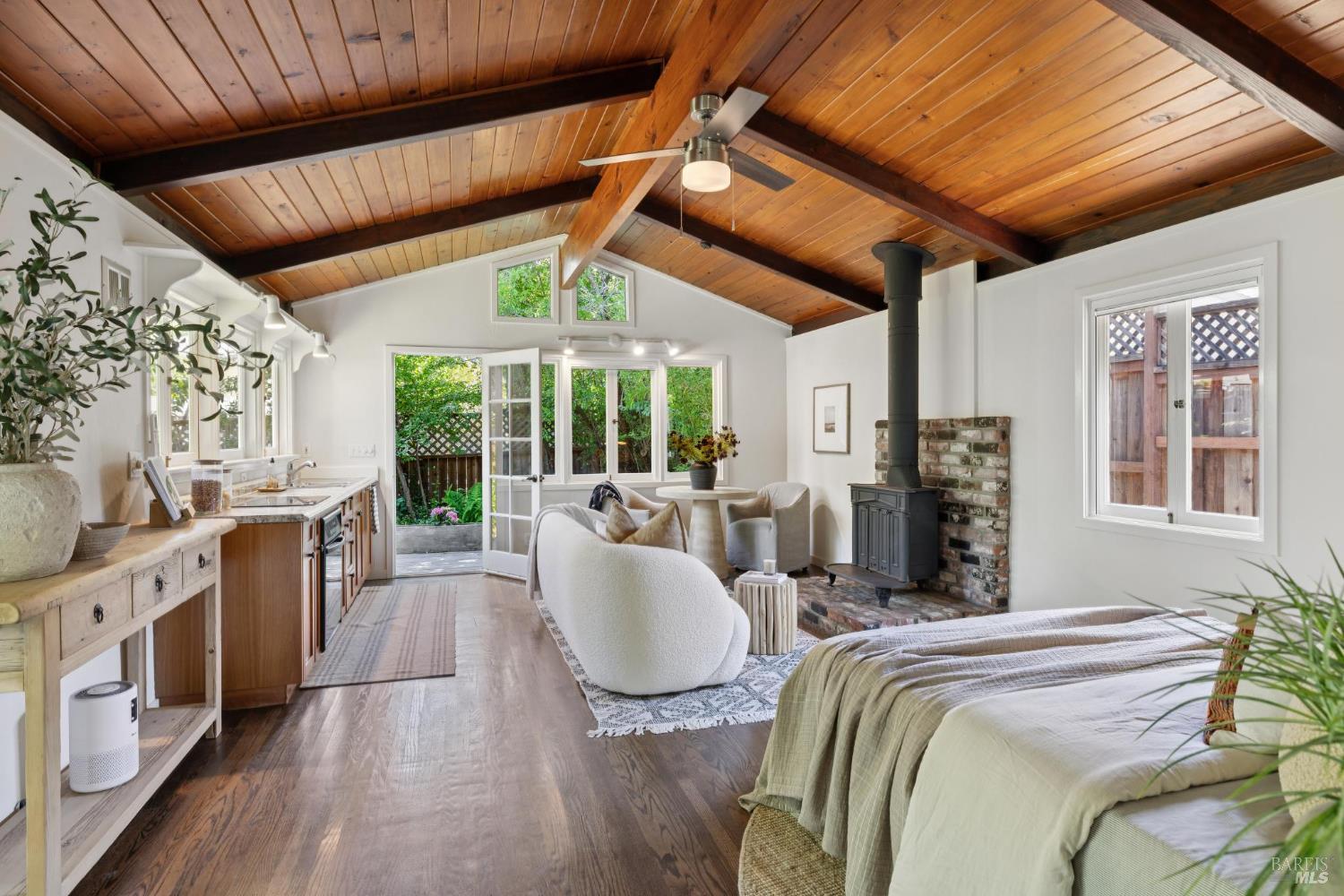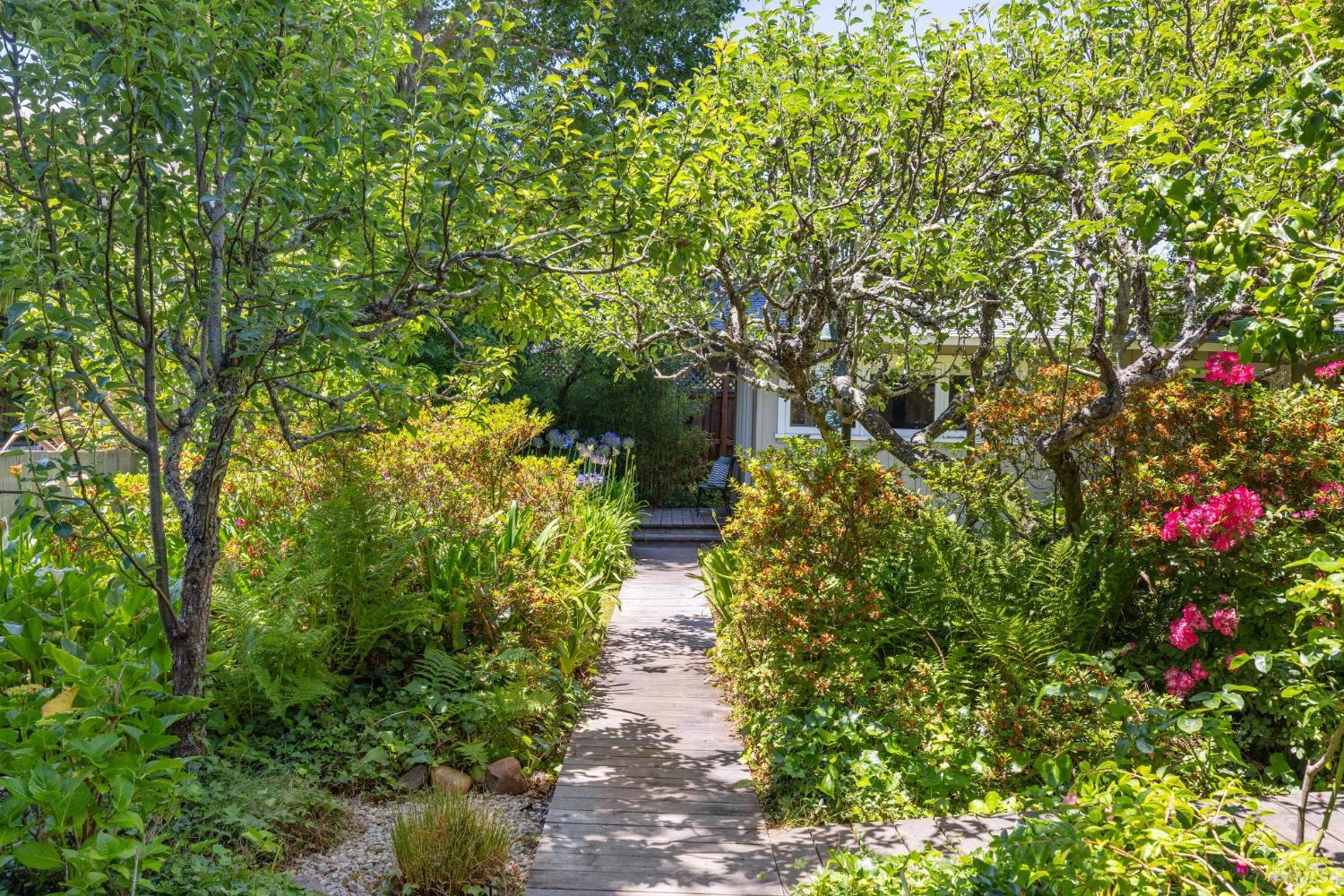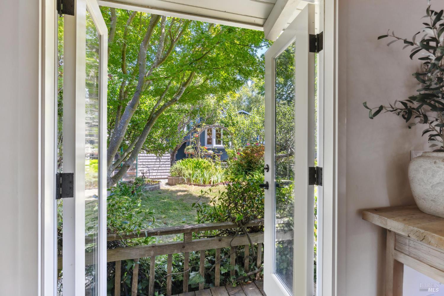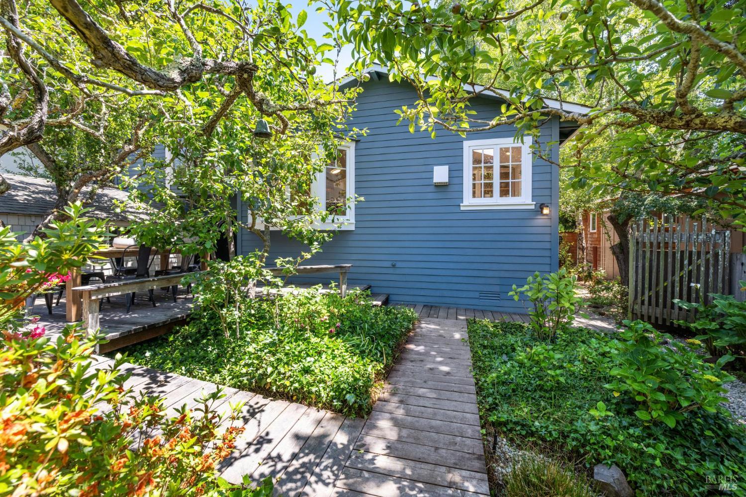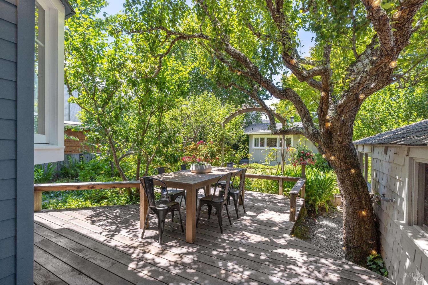Set on a sunny, level lot, this charming property includes a 3-bedroom, 2-bath main home plus a studio cottage with a full kitchen and bath. Together, they offer a rare combination of character and flexibility. Built in 1917 and lovingly cared for and expanded, the property blends classic details with thoughtful upgrades, including solar, A/C, heat pump, induction ranges, electric ovens and more. Inside the main house, hardwood floors, built-ins and a fireplace create an inviting atmosphere. The ensuite primary bedroom features vaulted ceilings and peaceful garden views. The eat-in kitchen opens directly to a sunny deck and a private, enclosed gardenperfect for al fresco dining or enjoying a quiet moment outdoors. The garden is a standout featurealive with blooming flowers, mature fruit trees, and tucked-away spots that invite reflection and play. A spacious shed provides room for potting, projects, or storage. The cottage adds flexibility with its own kitchen, full bath, wood-burning stove, electric heat, A/C, and hardwood floors. Just blocks from the eclectic energy of Tam Junction, you're moments from Good Earth Natural Foods, cafes, and shops. Enjoy access to renowned hiking and biking trails, highly regarded Mill Valley Schools and a scenic commute to San Francisco.