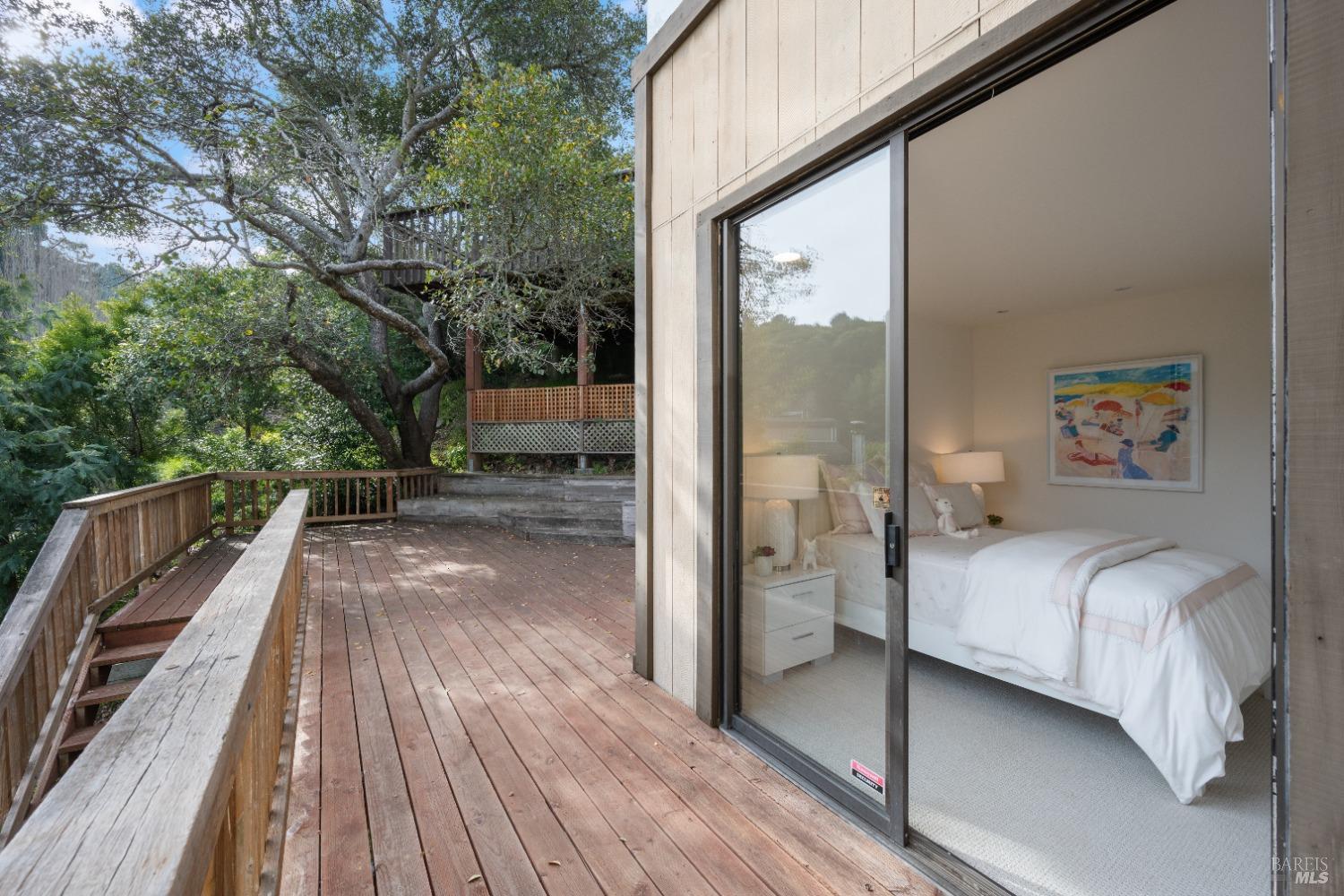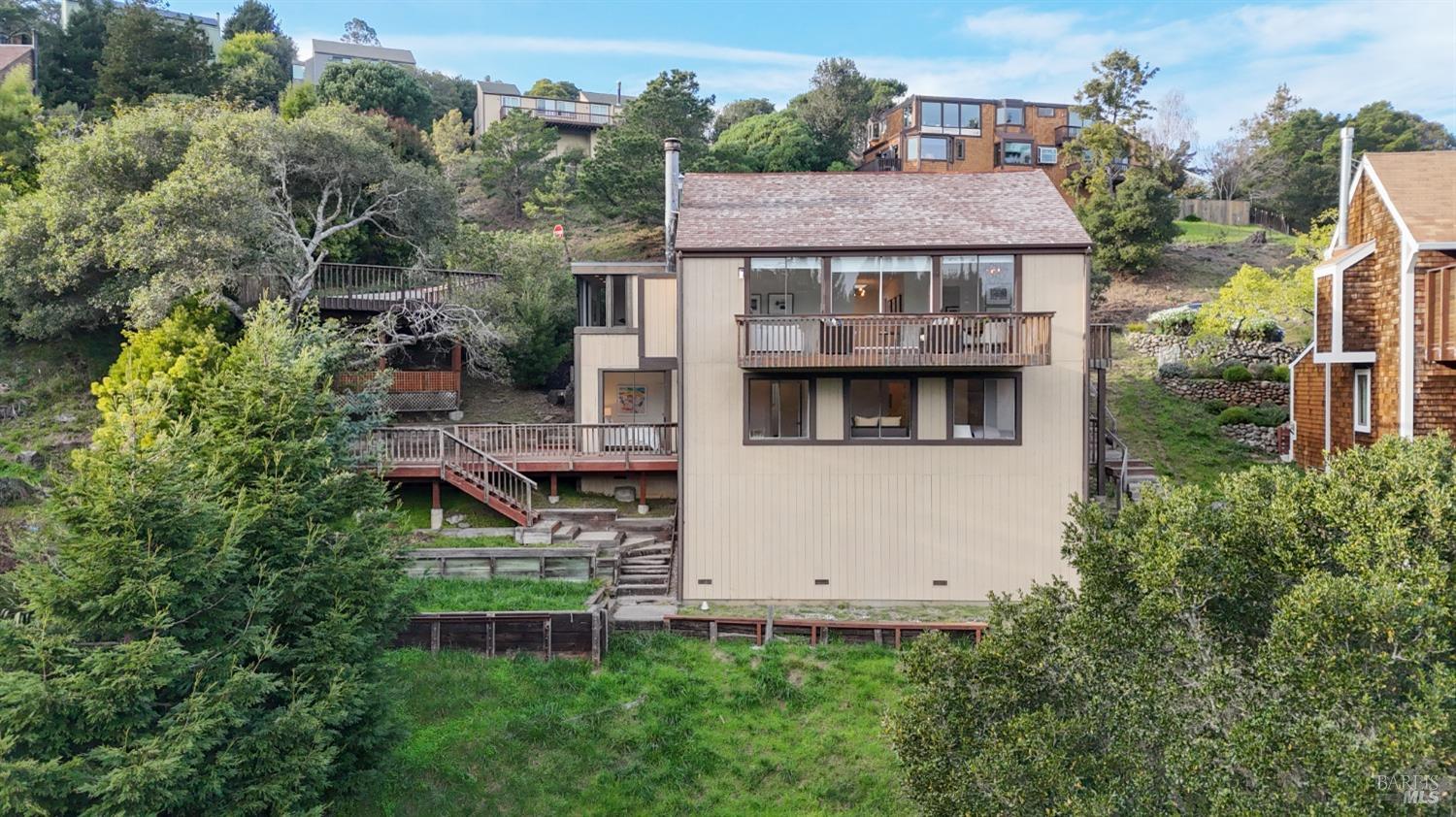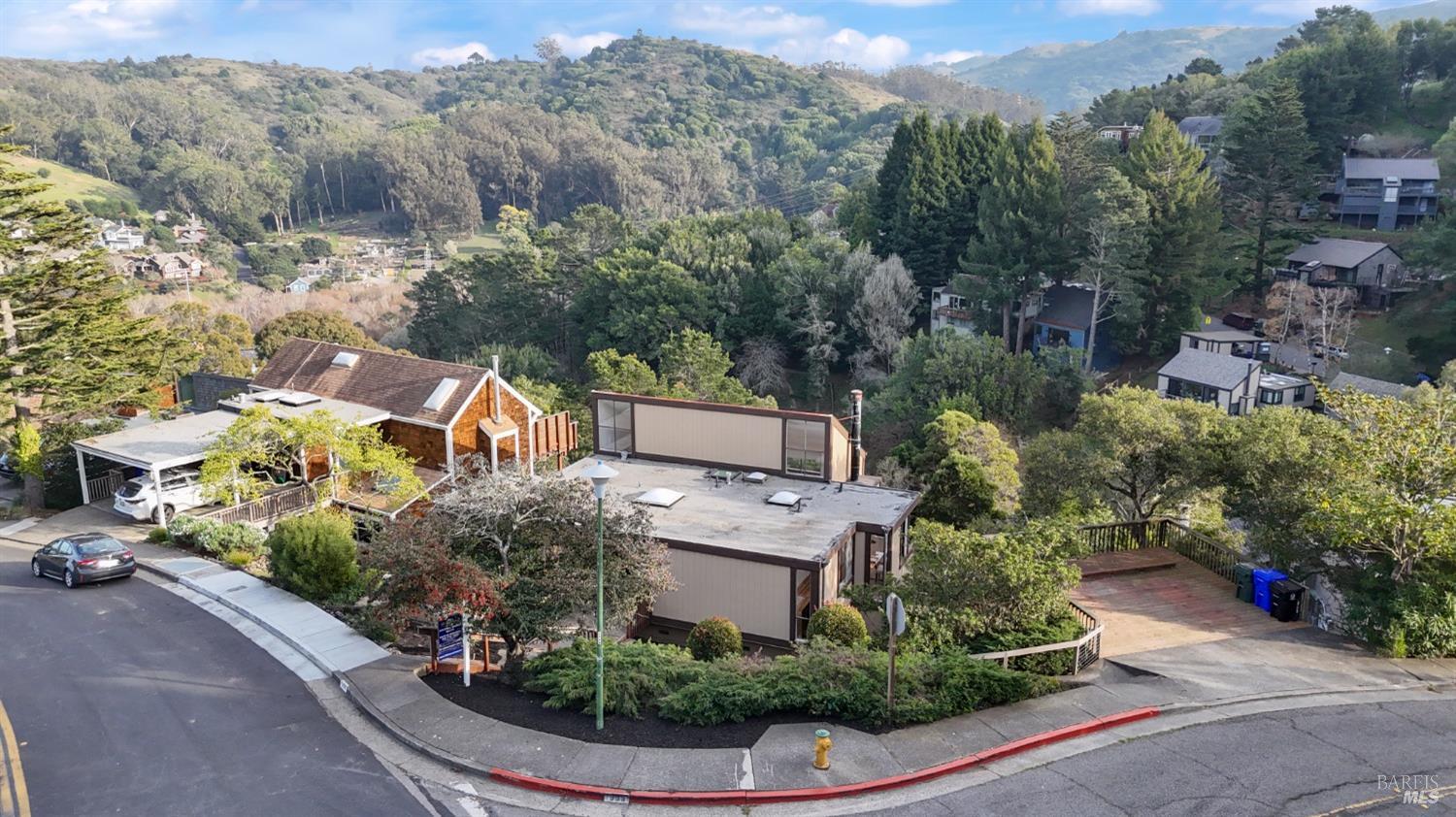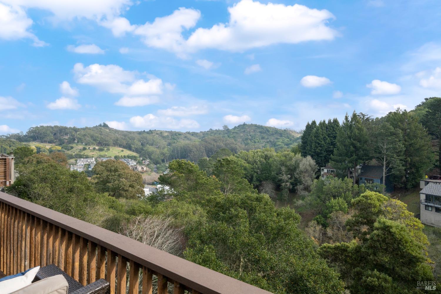 Move right in to this appealing 2 story home, well situated on a corner lot with low maintenance landscaping, pleasant valley views and a 2-car detached parking deck. There are 5 bedrooms and 2.5 baths in this contemporary residence. The primary suite with sitting area, bath with double sinks, and a walk-in closet are located on the main level. The kitchen/family room leads to an adjoining sun deck, perfect for morning coffee or an afternoon BBQ. There are vaulted ceilings in the spacious living/dining area with outdoor access to an expansive sun deck, capturing hillside open space and valley views. The lower level consists of 4 bedrooms, a full bath and a laundry room. One of the bedrooms has outdoor access to a private deck. Near 101 and on the Southern tip of Marin County, Marin View was designed to harmoniously blend with nature, dramatically perched above the popular Tennessee Valley Road, gateway to the major hiking trail and National Park, Tennessee Valley Trail and Beach. An offshoot of the Marin Headlands and incredibly close to San Francisco, Tennessee Valley, offers a pristine wildlife zone with a small beach where, along the path, hikers see treasured animals and bird species, including bobcats, deer, foxes, coyotes and luscious springtime displays of native plant