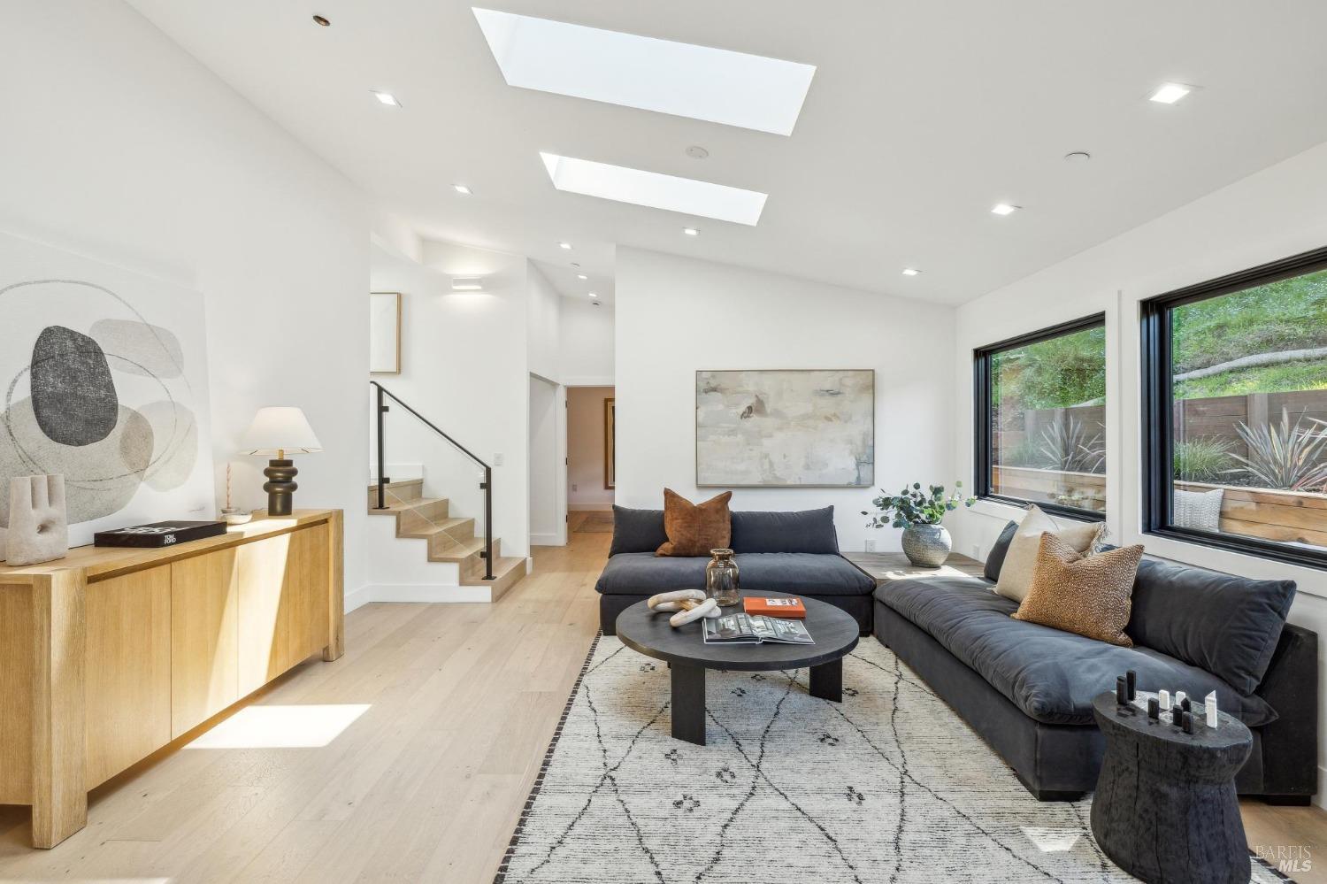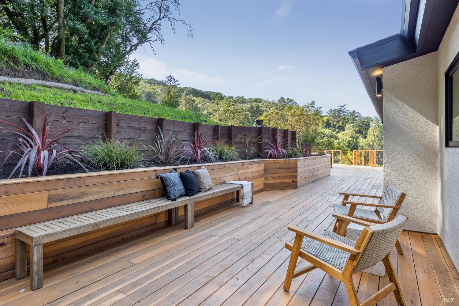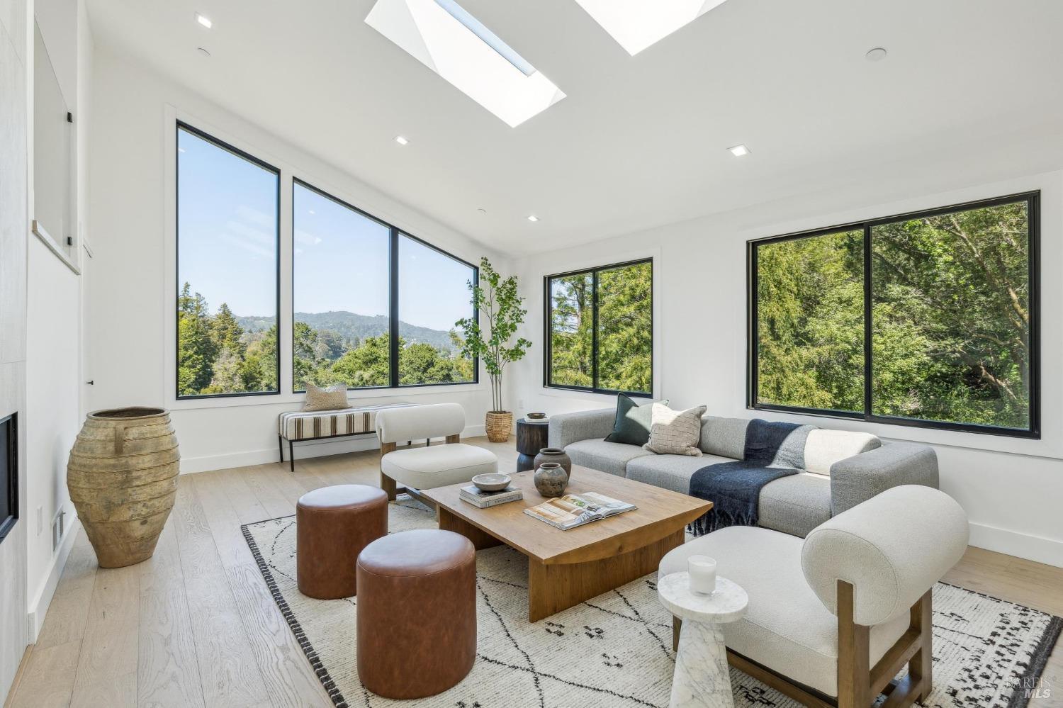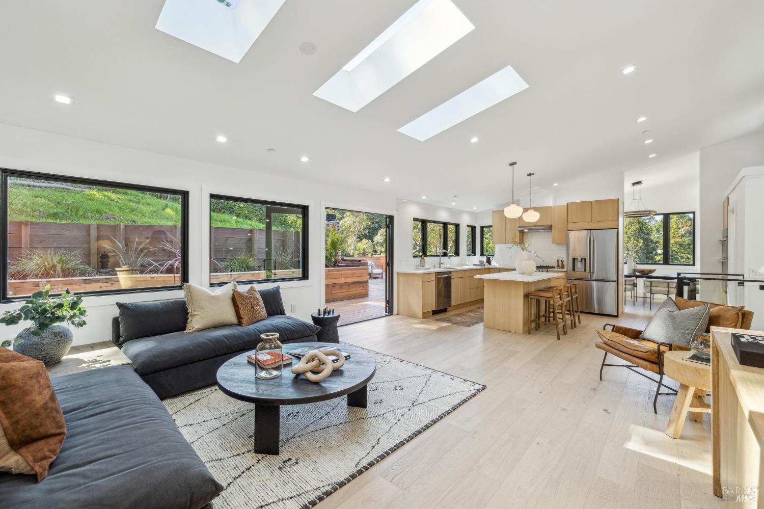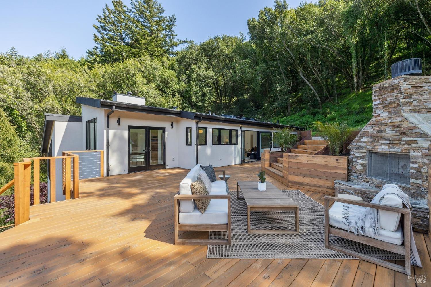 Perched on nearly 1.5 acres of private hillside in desirable Homestead Valley, this fully rebuilt contemporary residence offers an extraordinary combination of scale, style, and serenity. The home spans approximately 4,450 square feet of refined living space, offering 5 bedrooms, 4 full bathrooms, and a flexible layout designed for modern living. This light filled home unfolds across multiple levels with soaring ceilings, expansive decks, and sweeping views. The clean modern architecture harmonizes beautifully with its natural surroundings while showcasing the property's exceptional privacy. With beautifully reimagined interiors and sleek finishes, this is a property that lives as impressively as it shows. Included is a sizable luxurious primary suite, wide open outdoor entertaining space, two separate laundry areas, generous storage, and parking for 6 vehicles. This home offers a thoughtfully designed in-law space ideal for extended family, or guests, and ensures both convenience and privacy throughout. With Easy access to Highway 101, come experience this move-in-ready home that's just a stone's throw from Mill Valley's award-winning schools, vibrant shops, restaurants, and hiking trails.