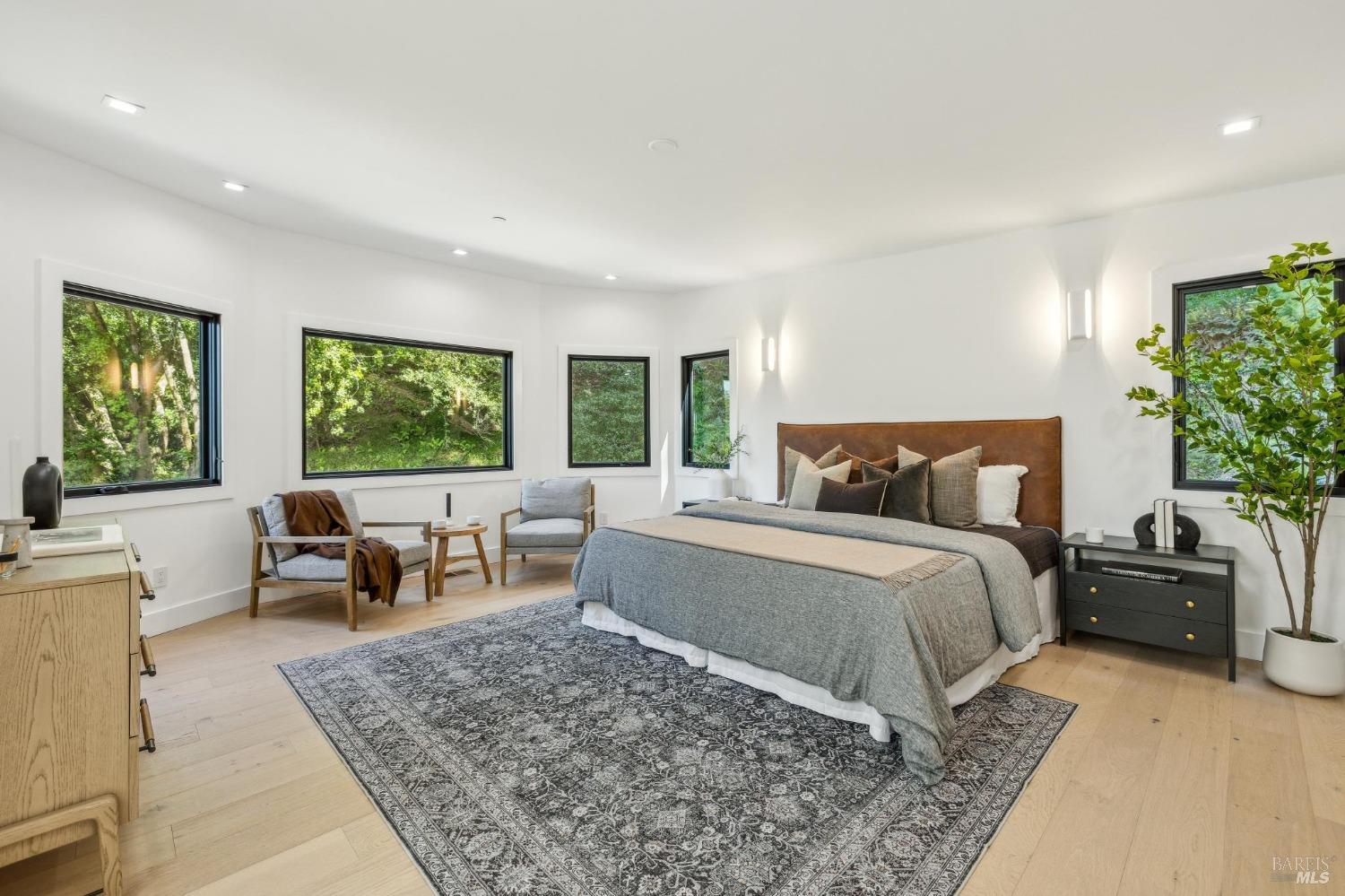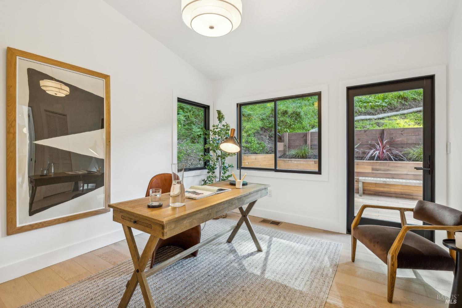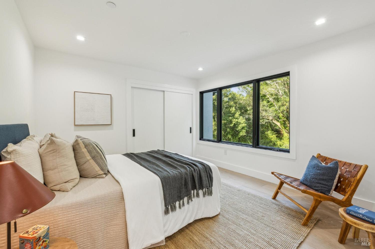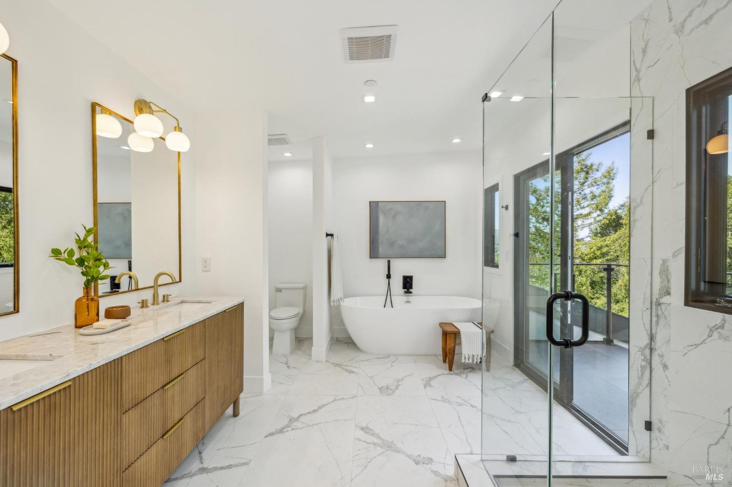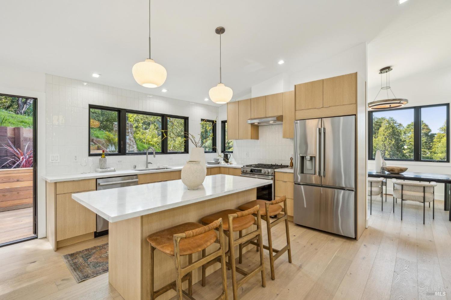 Perched on nearly 1.5 acres of private hillside in desirable Homestead Valley, this fully rebuilt contemporary residence offers an extraordinary combination of scale, style, and serenity. The home spans approximately 4,450 square feet of refined living space, offering 5 bedrooms, 4 full bathrooms, and a flexible layout designed for modern living. This light filled home unfolds across multiple levels with soaring ceilings, expansive decks, and sweeping views. The clean modern architecture harmonizes beautifully with its natural surroundings while showcasing the property's exceptional privacy. With beautifully reimagined interiors and sleek finishes, this is a property that lives as impressively as it shows. Included is a sizable luxurious primary suite, wide open outdoor entertaining space, two separate laundry areas, generous storage, and parking for 6 vehicles. This home offers a thoughtfully designed in-law space ideal for extended family, or guests, and ensures both convenience and privacy throughout. With Easy access to Highway 101, come experience this move-in-ready home that's just a stone's throw from Mill Valley's award-winning schools, vibrant shops, restaurants, and hiking trails.
