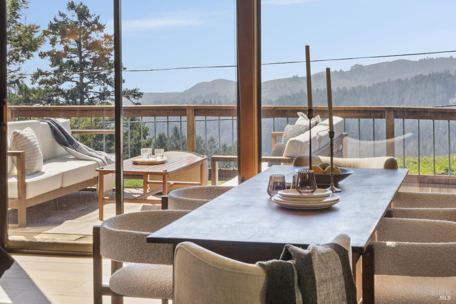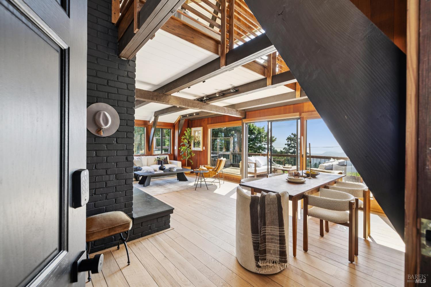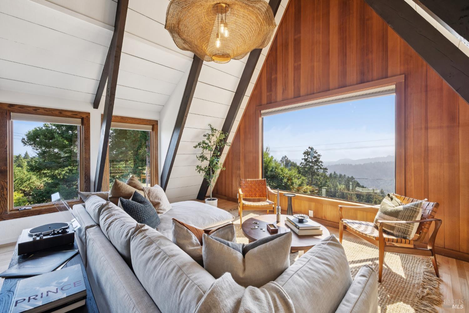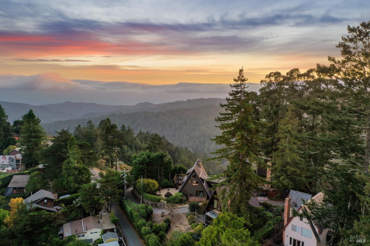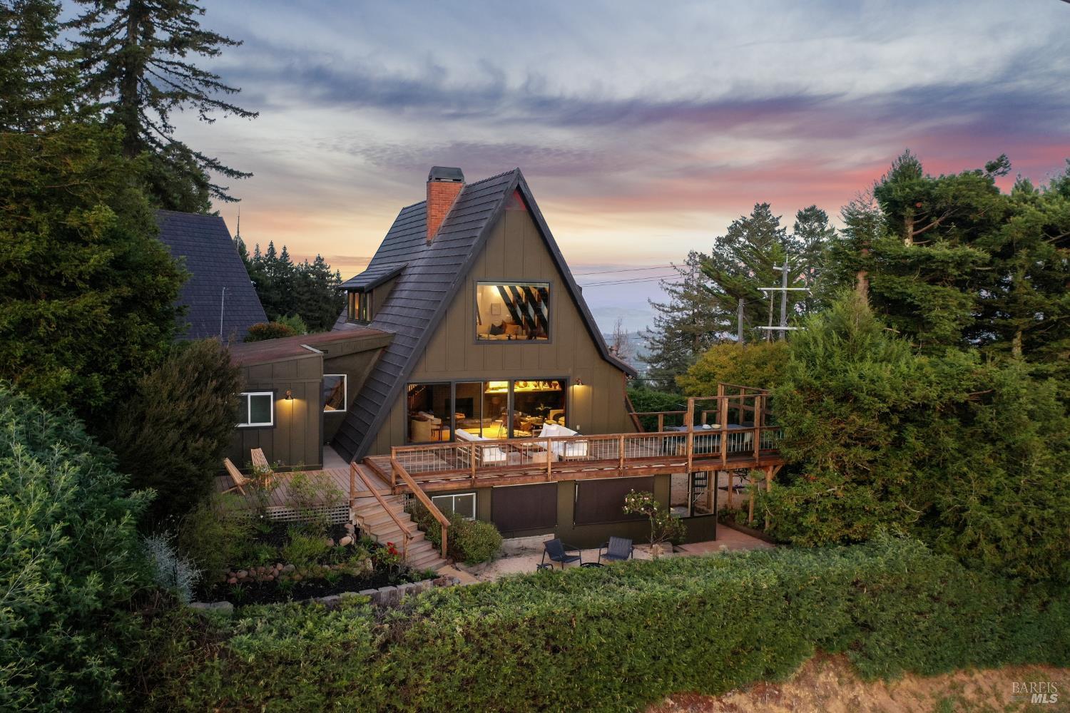 Rare architecturally striking A-frame retreat where sweeping ocean + bay views meet modern design creating a sanctuary for the soul. There is a rich sense of history w/ the warmth of wood + beam ceilings elevated by designer touches. Enjoy an open floor plan that soaks in the light filled views & invites you to step outside to expansive outdoor areas perfect for sunset barbecues & starlit gatherings. The community areas bright w/ expansive vistas anchor the home w/ a perfect flow between the designer kitchen, bar seating, dining area & the living room w/ a cozy wood burning fireplace. The private primary suite is also on the main level w/ direct deck access & stunning spa-like bath. Upstairs, a dramatic family room w/ soaring ceilings captures incredible ocean views. A spacious bedroom w/ bay views, previously two rooms (easily converted back) & a 2nd remodeled bath complete this level. Above it all, a whimsical loft offers bay vistas + possibilities for a 4th bedroom, office or play space. Set on a private cul-de-sac enclave, on an expansive 8,250 sqft lot w/ gardens, a redwood grove, garden shed, storage & wine cellar. Minutes to DTMV, distinguished schools, Muir Woods + Beaches. Strolling distance to the Muir Woods Park Comm Assoc, Mt Home Inn & Tourist Club