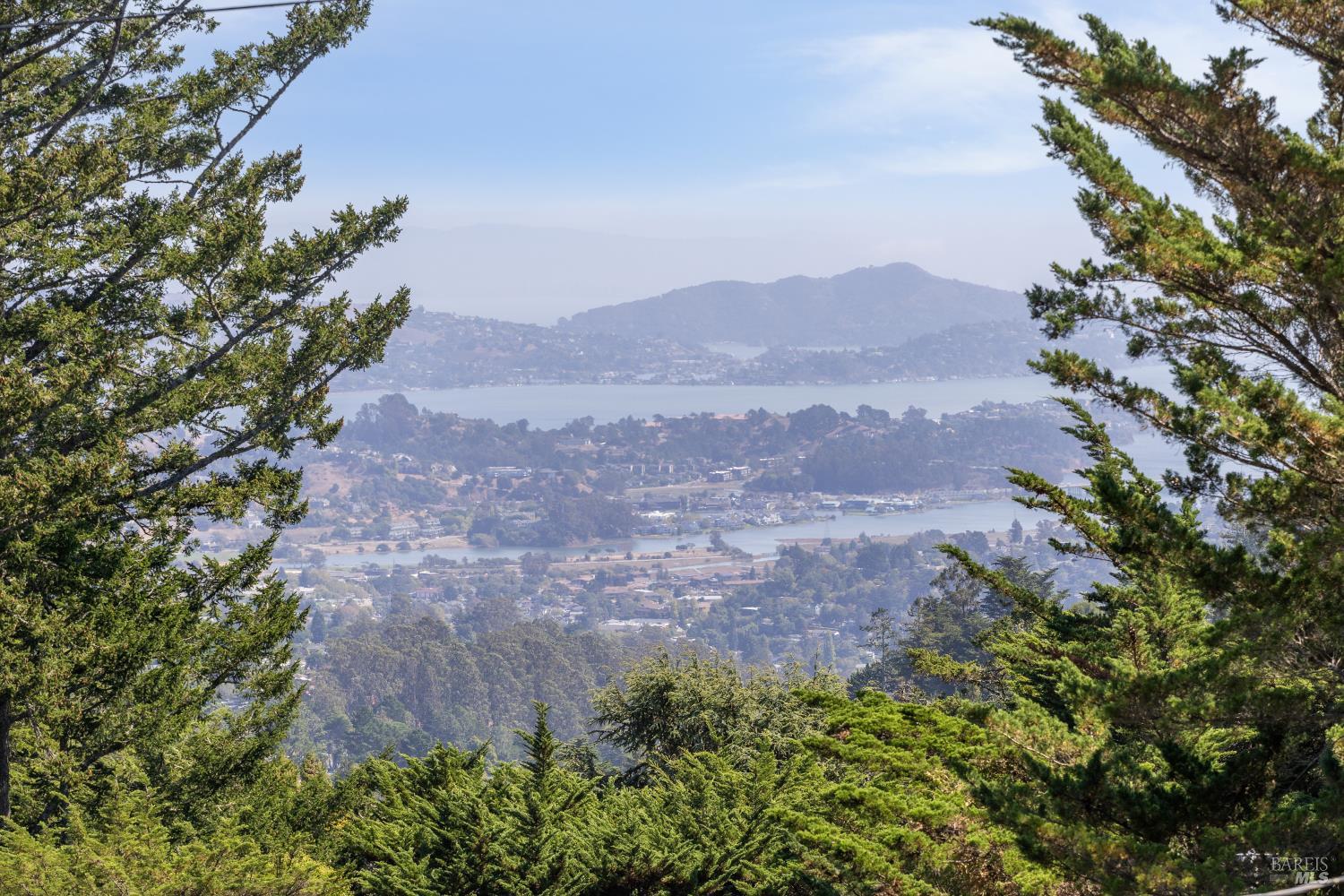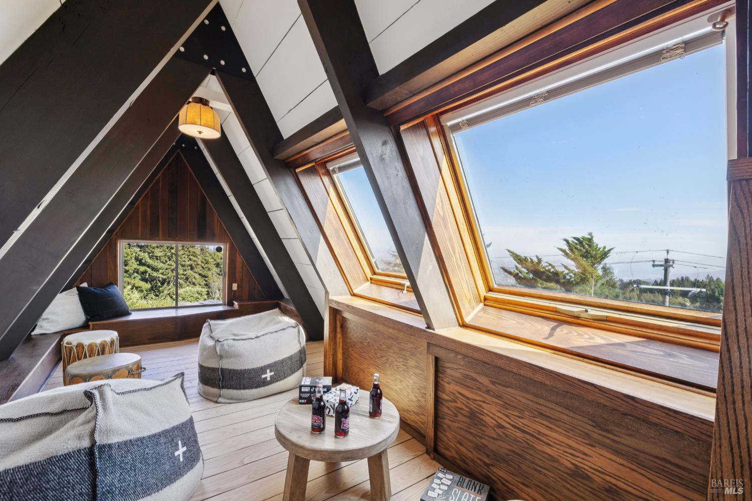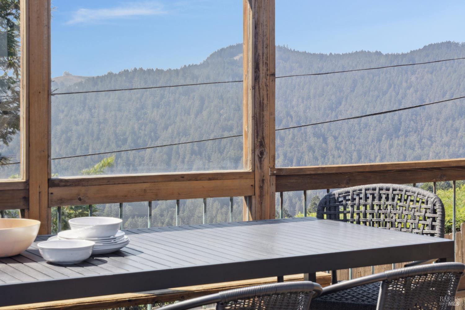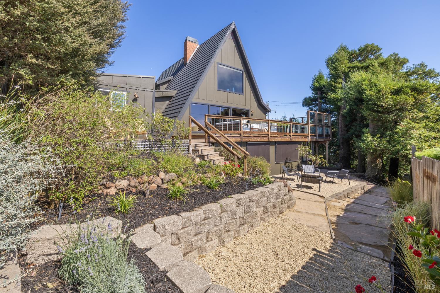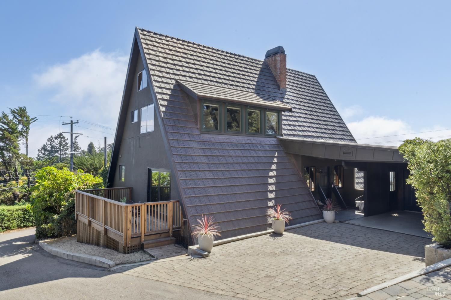 Rare architecturally striking A-frame retreat where sweeping ocean + bay views meet modern design creating a sanctuary for the soul. There is a rich sense of history w/ the warmth of wood + beam ceilings elevated by designer touches. Enjoy an open floor plan that soaks in the light filled views & invites you to step outside to expansive outdoor areas perfect for sunset barbecues & starlit gatherings. The community areas bright w/ expansive vistas anchor the home w/ a perfect flow between the designer kitchen, bar seating, dining area & the living room w/ a cozy wood burning fireplace. The private primary suite is also on the main level w/ direct deck access & stunning spa-like bath. Upstairs, a dramatic family room w/ soaring ceilings captures incredible ocean views. A spacious bedroom w/ bay views, previously two rooms (easily converted back) & a 2nd remodeled bath complete this level. Above it all, a whimsical loft offers bay vistas + possibilities for a 4th bedroom, office or play space. Set on a private cul-de-sac enclave, on an expansive 8,250 sqft lot w/ gardens, a redwood grove, garden shed, storage & wine cellar. Minutes to DTMV, distinguished schools, Muir Woods + Beaches. Strolling distance to the Muir Woods Park Comm Assoc, Mt Home Inn & Tourist Club