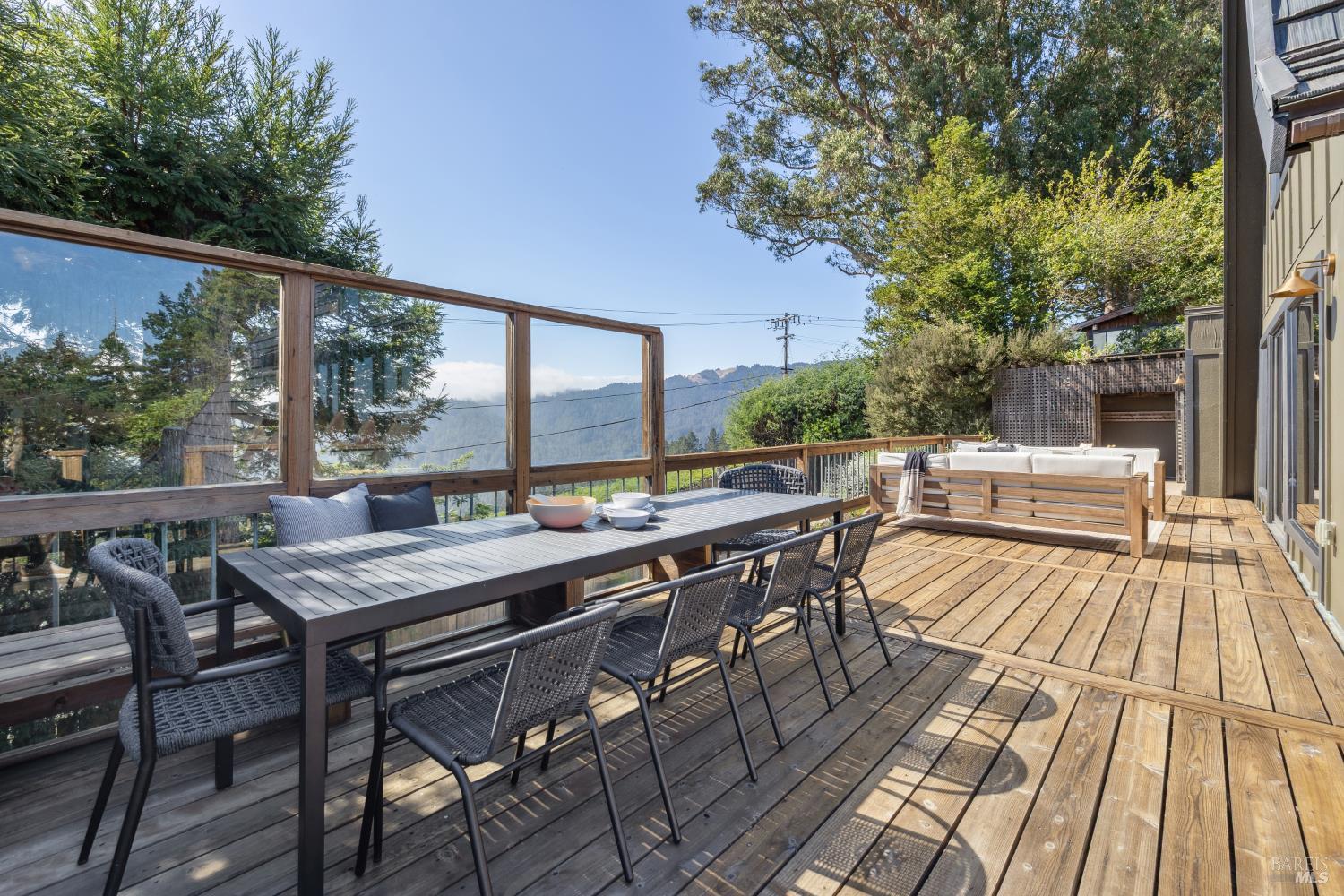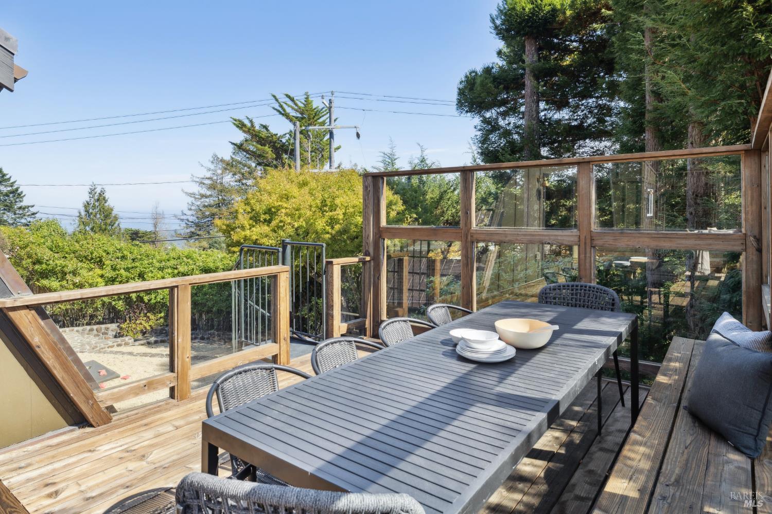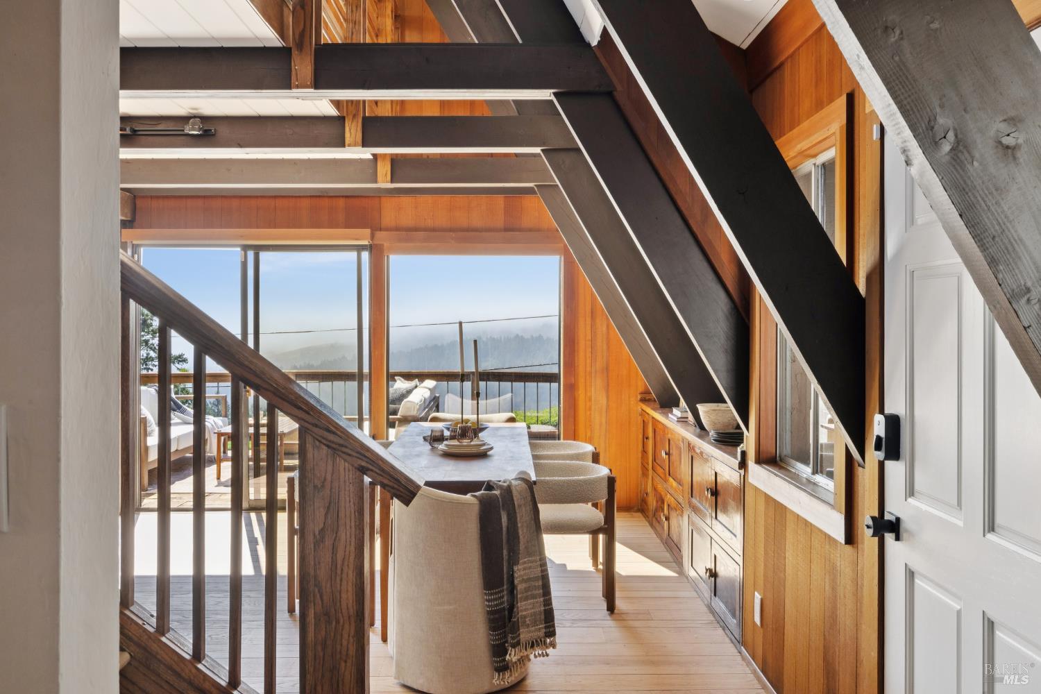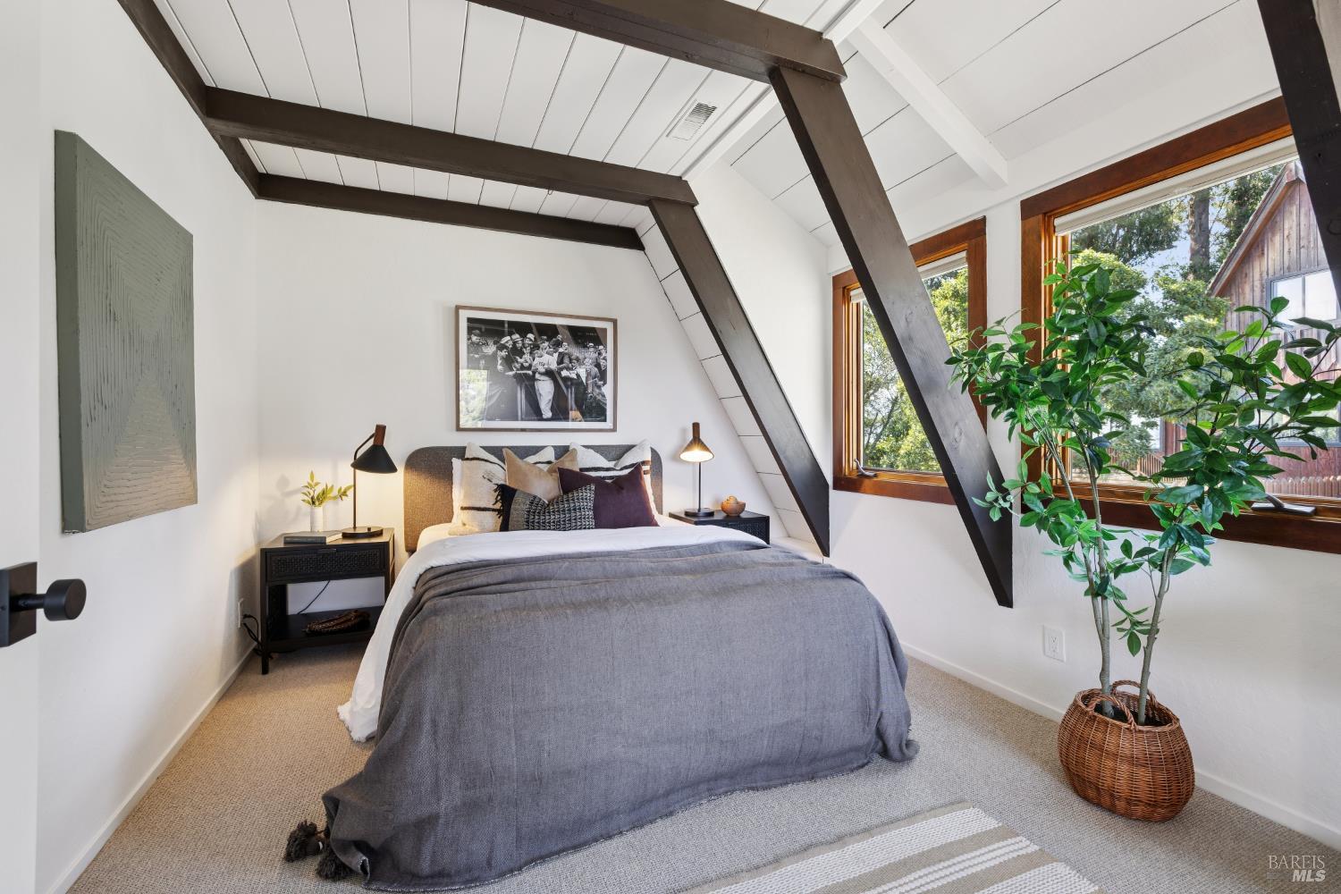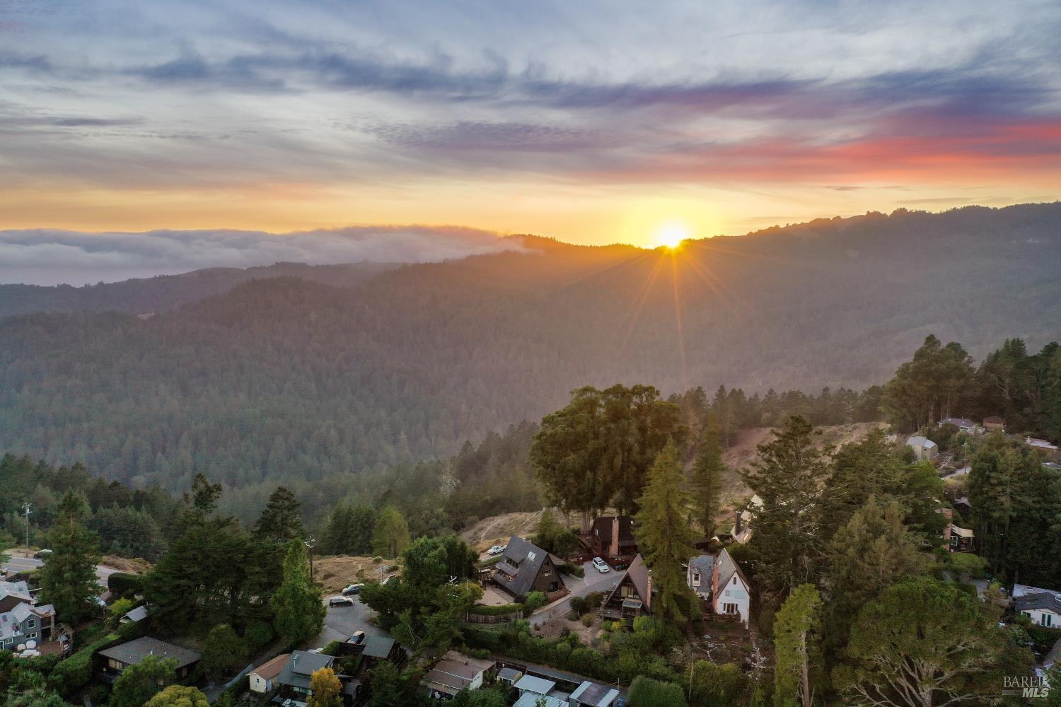 Rare architecturally striking A-frame retreat where sweeping ocean + bay views meet modern design creating a sanctuary for the soul. There is a rich sense of history w/ the warmth of wood + beam ceilings elevated by designer touches. Enjoy an open floor plan that soaks in the light filled views & invites you to step outside to expansive outdoor areas perfect for sunset barbecues & starlit gatherings. The community areas bright w/ expansive vistas anchor the home w/ a perfect flow between the designer kitchen, bar seating, dining area & the living room w/ a cozy wood burning fireplace. The private primary suite is also on the main level w/ direct deck access & stunning spa-like bath. Upstairs, a dramatic family room w/ soaring ceilings captures incredible ocean views. A spacious bedroom w/ bay views, previously two rooms (easily converted back) & a 2nd remodeled bath complete this level. Above it all, a whimsical loft offers bay vistas + possibilities for a 4th bedroom, office or play space. Set on a private cul-de-sac enclave, on an expansive 8,250 sqft lot w/ gardens, a redwood grove, garden shed, storage & wine cellar. Minutes to DTMV, distinguished schools, Muir Woods + Beaches. Strolling distance to the Muir Woods Park Comm Assoc, Mt Home Inn & Tourist Club